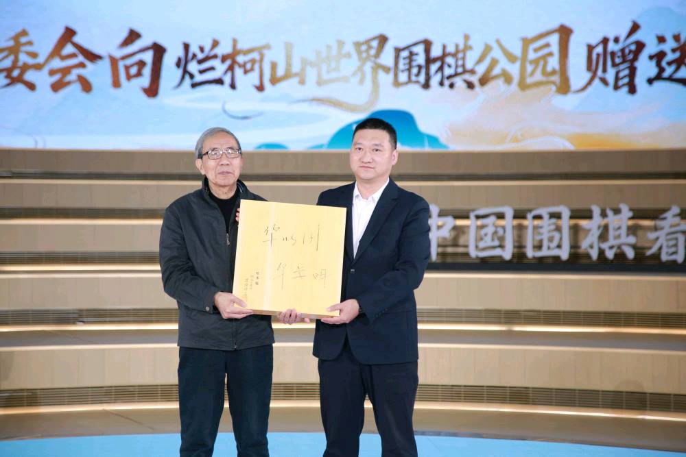 在特色环节中,全国新闻媒体围棋赛组委会向烂柯山世界围棋公园捐赠签名棋盘,衢州城控集团副董事长、总经理付亚民从中国围棋协会名誉主席华以刚手中接收棋盘。这一仪式象征着围棋文化的传递与延续。