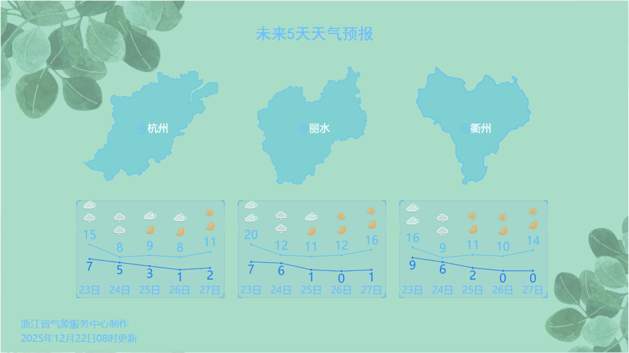 说回浙江,昨天(12月22日),上周末开始的这场冷空气的影响虽然趋于结束。但在阴云笼罩下,气温回升力度并不算大,最高气温浙北9-11℃,其他地区13-15℃。其中湖州、德清、临安、嵊州、萧山、临平最高不足10℃。