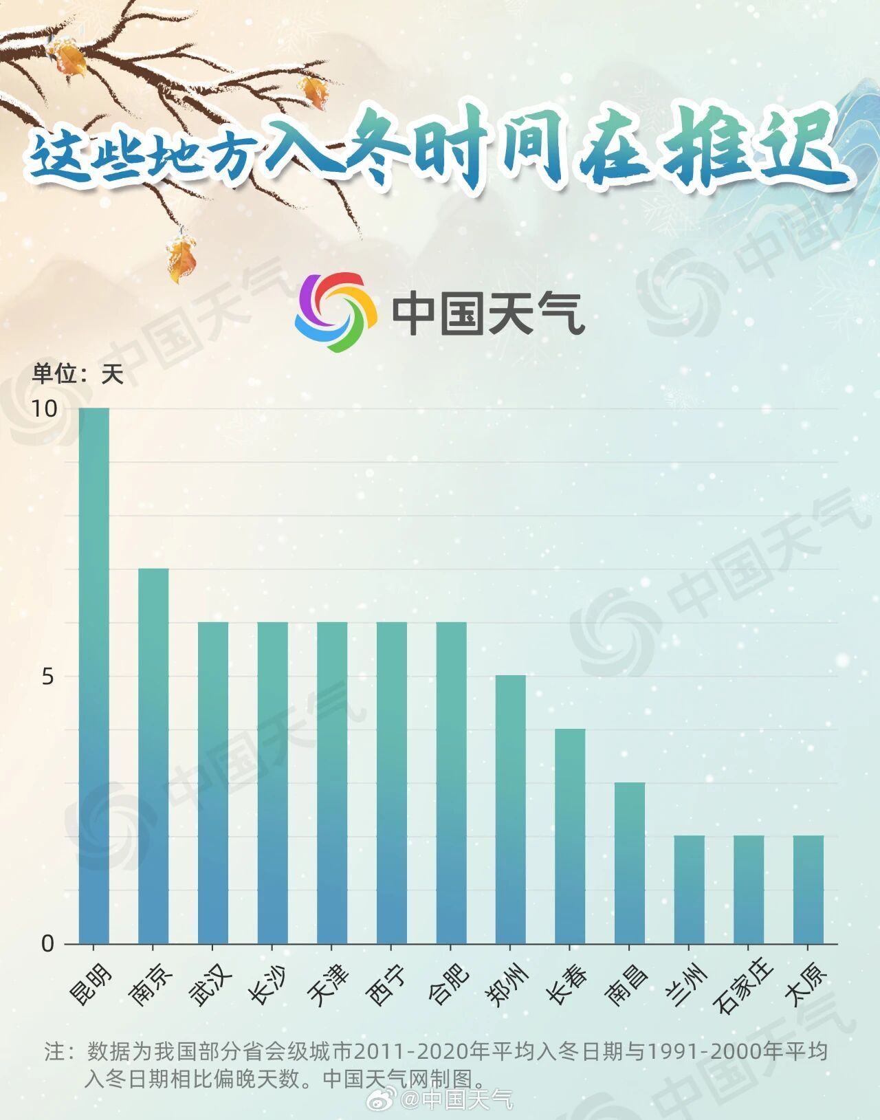对比20世纪90年代和2011年至2020年近十年的平均入冬时间,昆明推迟10天,南京、合肥、武汉等地从11月中旬推迟到11月下旬,延迟超过5天,此外,杭州、长春、南昌等城市的冬季也比之前晚了3到5天。